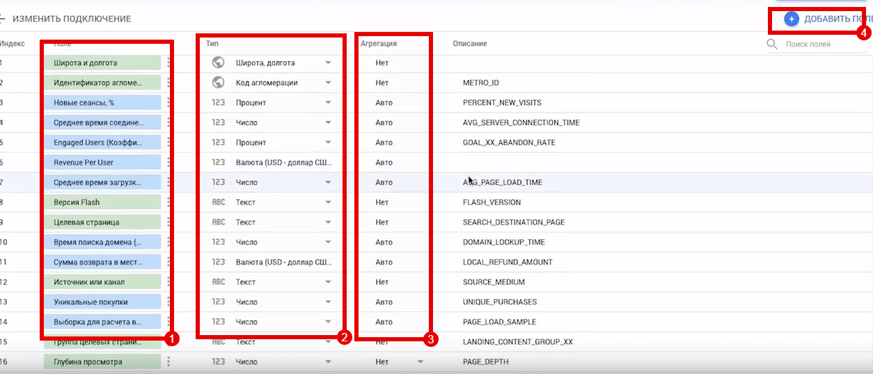 - «Добавить поле» – добавление собственной метрики, не присутствующей в списке.