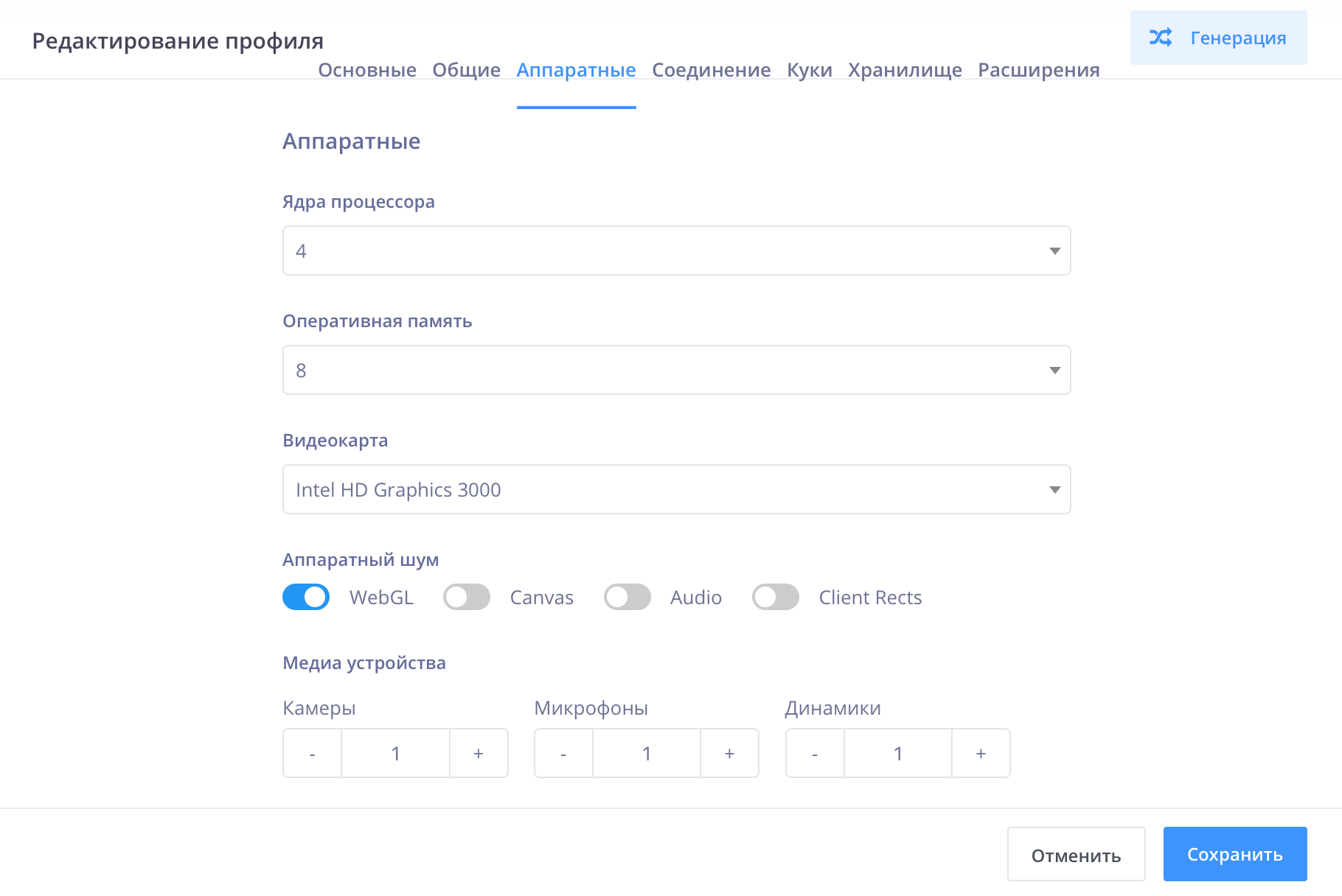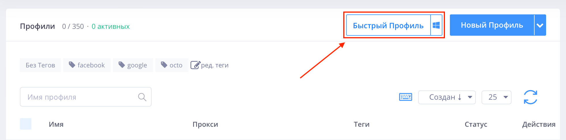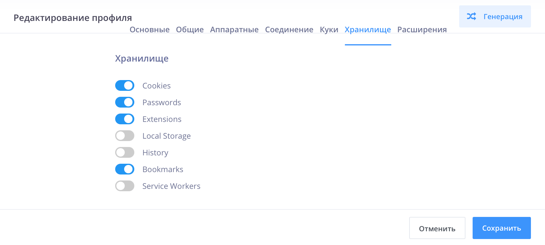 - Быстрое создание профиля — профиль для работы можно сгенерировать в один клик.