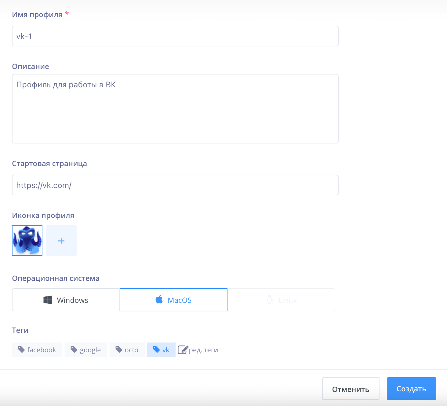 Самая важная опция на этом этапе — это операционная система. Остальные настройки профилей можно оставить по умолчанию, так как для работы этого будет достаточно. В завершении кликаем «Создать» и профиль готов к работе.