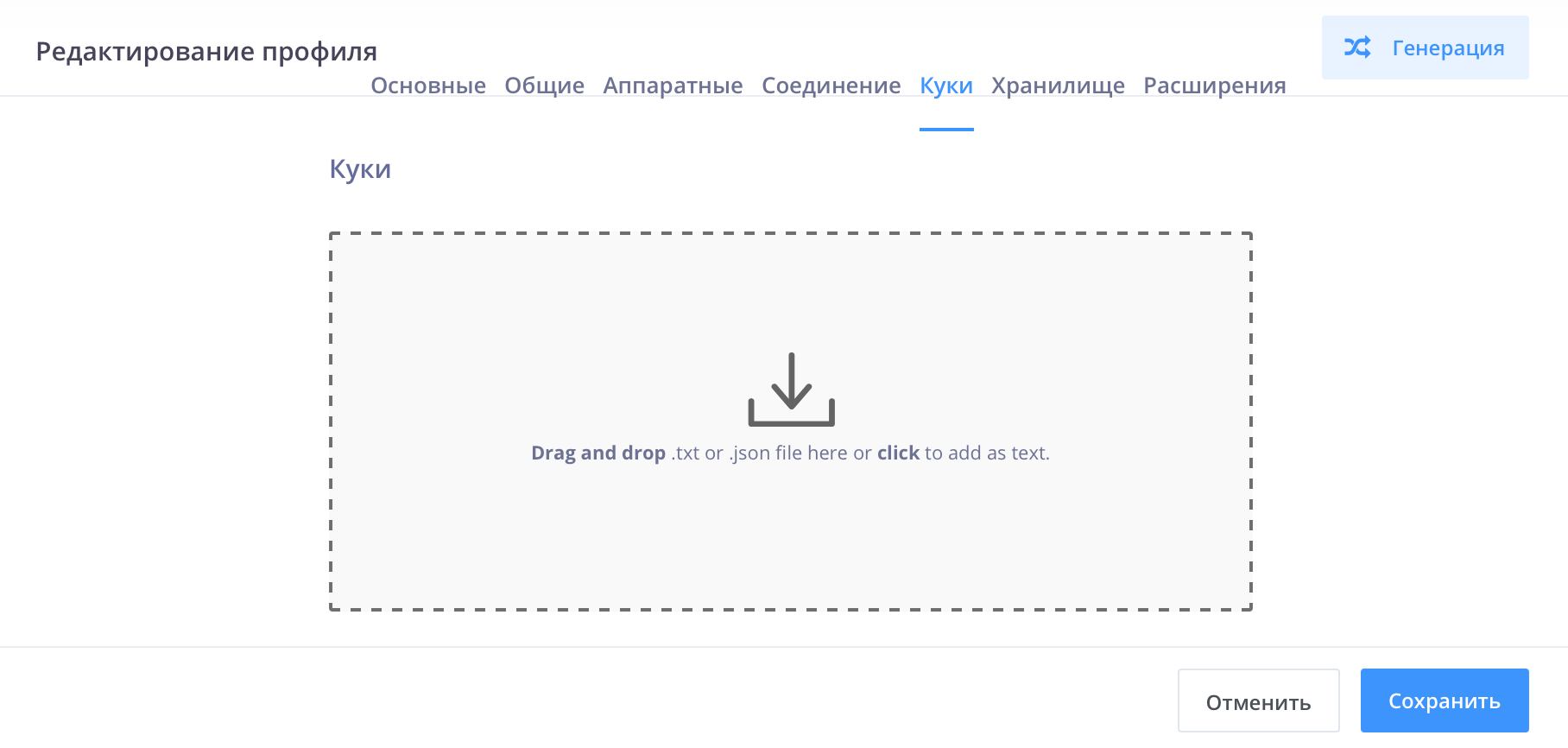 Куки — здесь можно загрузить файлы куки в форматах JSON и Netscape. Кроме того, есть возможность загрузить несколько файлов сразу
