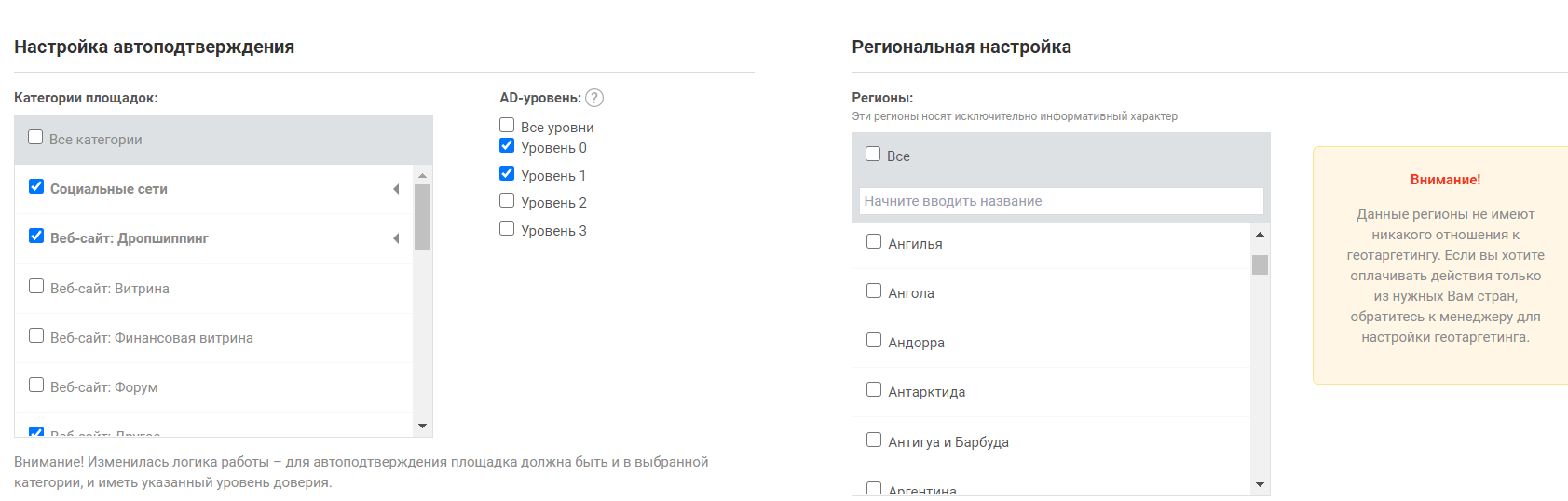 - География. Важный пункт для работающих по всему миру бизнесов. Позволяет диверсифицировать ставки по регионам и назначать вознаграждение в различной валюте. Список стран необходимо указывать для точности таргетинга.