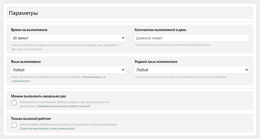 4. Настраиваем параметры задания. Время на выполнение, количество выполнений в день, язык выполнения и исполнителя. Если задание можно выполнять несколько раз — ставим галочку. Если оно должно показываться исполнителям с высоким рейтингом — тоже ставим галочку.
