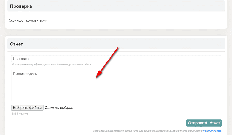 Также есть поле для отправки отчета. Обычно для проверки используется скриншот.