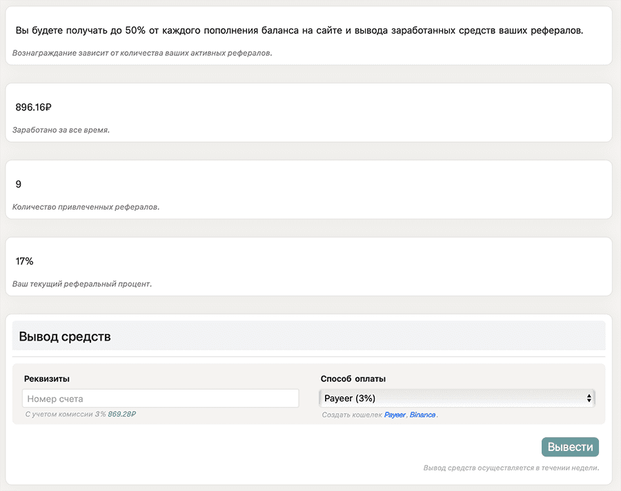 На странице отображается количество рефералов и ваш процент. Он зависит от активности, но максимально можно заработать до 50% от каждого пополнения или вывода средств рефералом.