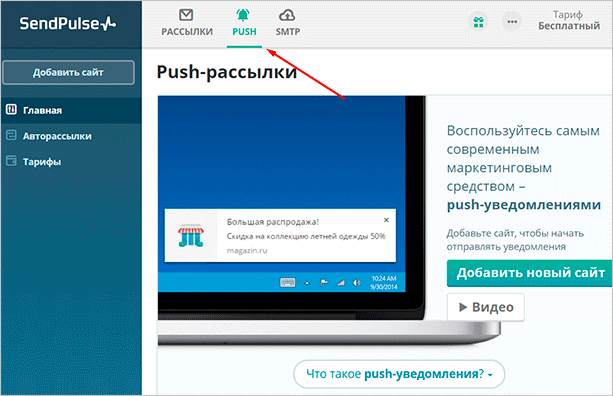 Как видите, в push-рассылке доступно всего 3 раздела – главная, авторассылки и тарифы. Именно ее можно использовать для создания уведомлений о выходе новых статей на информационных сайтах.