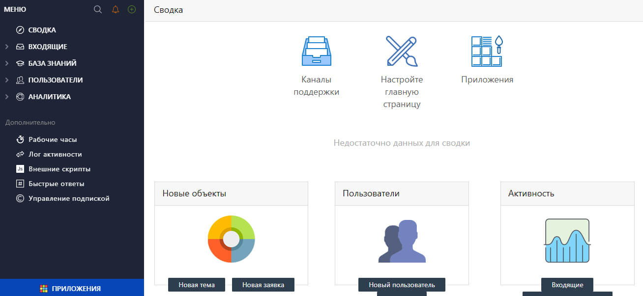 1. Сводка. Показывает сотрудникам быстрый обзор по всем темам, заявкам и активности.