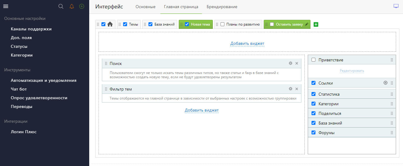 Можно настроить форму обратной связи, бизнес процессы, пригласить команду в сервис. Расширенные настройки системы находятся в разделе «Настройки/Приложения».