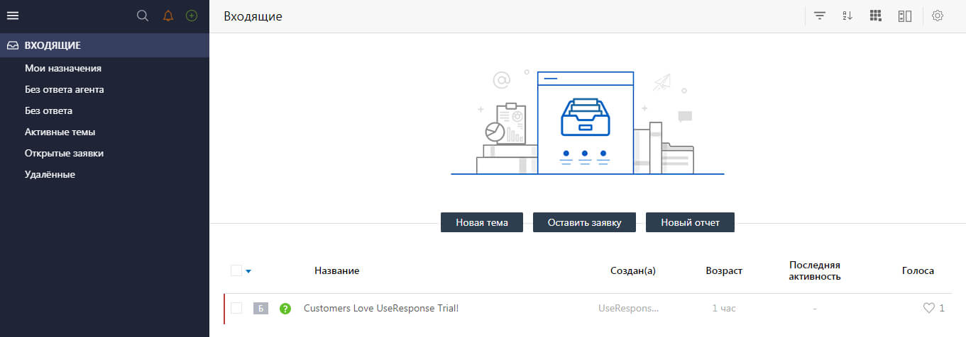 2. Входящие. В этом разделе отображаются все созданные темы и заявки из различных источников, и создаются отчеты по ним. Можно использовать отчеты по умолчанию или создать свои. Есть функция одновременного редактирования нескольких отчетов. Входящие можно отсортировать по открытым, удаленным, оставленным без ответа, также вы можете просмотреть активные темы. Фильтры позволяют вовремя реагировать на темы и заявки, выполнять их в порядке важности, закрывать или удалять неактивные.