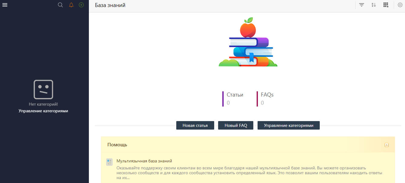 3. База знаний. В этом разделе добавляются статьи и F.A.Q. Для каждой лучше назначить свою категорию, чтобы клиентам было проще найти нужную информацию, а вам своевременно вносить изменения.