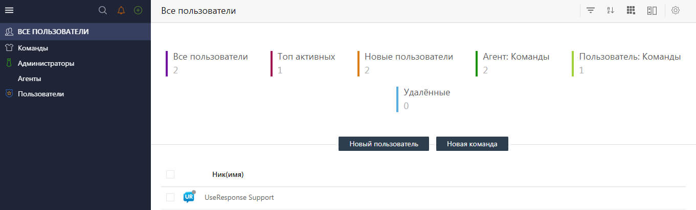 4. Все пользователи. Это раздел, в который можно добавлять как отдельных сотрудников, так и целые команды (например, отдел техподдержки, продаж). Также здесь отображаются ваши зарегистрированные пользователи. У каждого сотрудника есть своя карточка, где можно посмотреть его роль в команде, отправить ему сообщение или дать задачу. На главной странице раздела видно общее количество пользователей, количество новых, топ активных, удаленные.