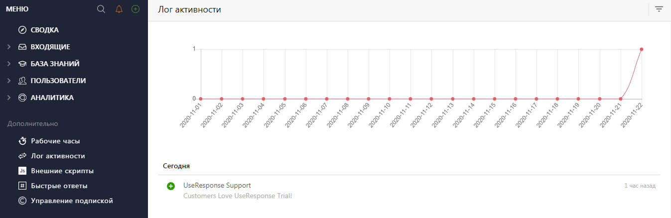 6. Дополнительные настройки. Здесь также можно настроить рабочие часы для команд, посмотреть лог активности сотрудников, добавить внешние скрипты (например, код аналитики), настроить быстрые ответы и изменить условия подписки на сервис UseResponse.