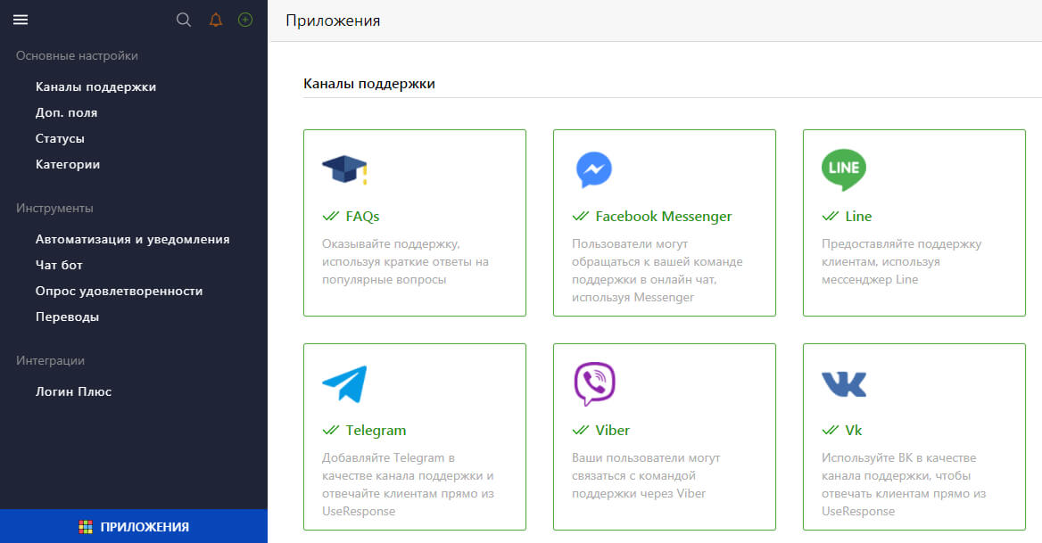 Более широкие настройки и возможности системы поддержки можно найти в настройках в разделе “Приложения”.
