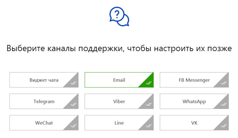 Базовая настройка. Во время первоначальной настройки чата выбираем каналы, по которым будут приниматься заявки в техподдержку: емейл, виджет чата, соцсети, мессенджеры. Позже их нужно будет настроить более детально.