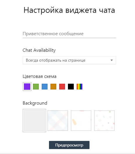 Если вы выбрали виджет чата, система предложит провести минимальные настройки. Например, выбрать цветовую схему и добавить приветственное сообщение.