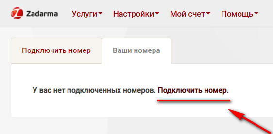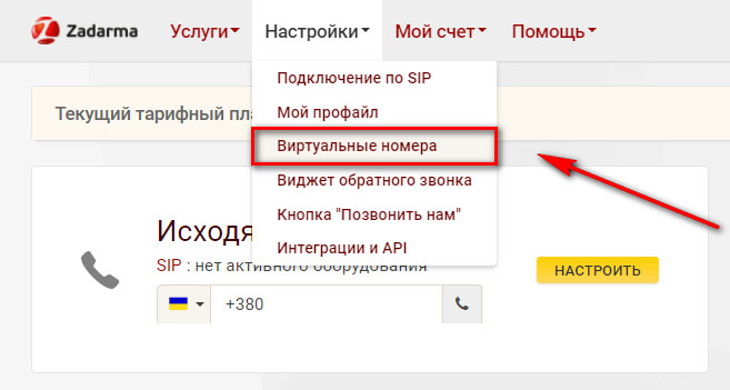 После регистрации на сайте Zadarma заходим в сервис и нажимаем на раздел «Настройки» в верхнем меню. Находим пункт «Виртуальные номера».