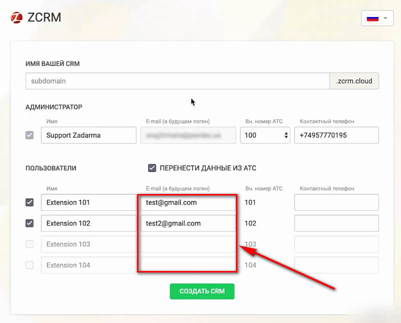 После выбора распределения входящих звонков, жмем «Дальше», и нас перекидывает на окно настройки ZCRM, если вы выбрали ее установку при подключении АТС. Если вы указали несколько сотрудников, то ваша учетная запись будет иметь права администратора, а у коллег будут роли модераторов. Чтобы добавить сотрудников в CRM, в ее настройках достаточно указать емейл-адреса коллег — они получат приглашение на почту с данными для входа в систему.