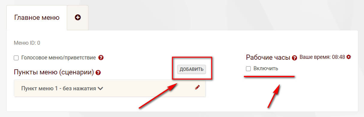 Переходим в пункт АТС, чтобы закончить настройки. Здесь можно добавить и настроить голосовое приветствие/меню на входящие. Чтобы создать несколько пунктов меню, жмем «Добавить», по умолчанию есть пункт «без нажатия», в нем нужно будет настроить номера работников, которые примут звонок, если клиент не выбрал ни один пункт меню. Это может быть сотрудник консультативного отдела, который затем перенаправит клиента на нужный отдел.