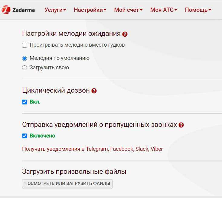 Ниже есть настройка мелодии в режиме ожидания (можно загрузить свою или использовать дефолтную), циклический дозвон (повторный звонок на занятый номер сотрудника), отправка уведомлений о пропущенных звонках в мессенджеры.