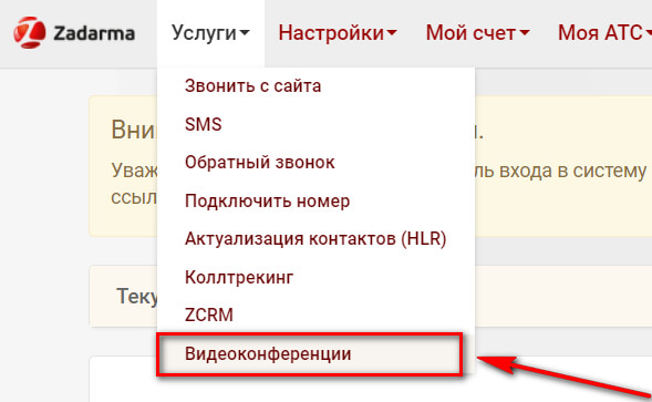 Конференция создается в пару кликов в личном кабинете сервиса. Заходим в раздел «Услуги» — «Видеоконференции».