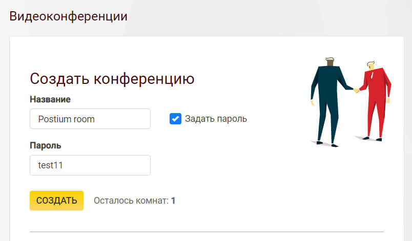 Указываем название комнаты, придумываем пароль и нажимаем «Создать».