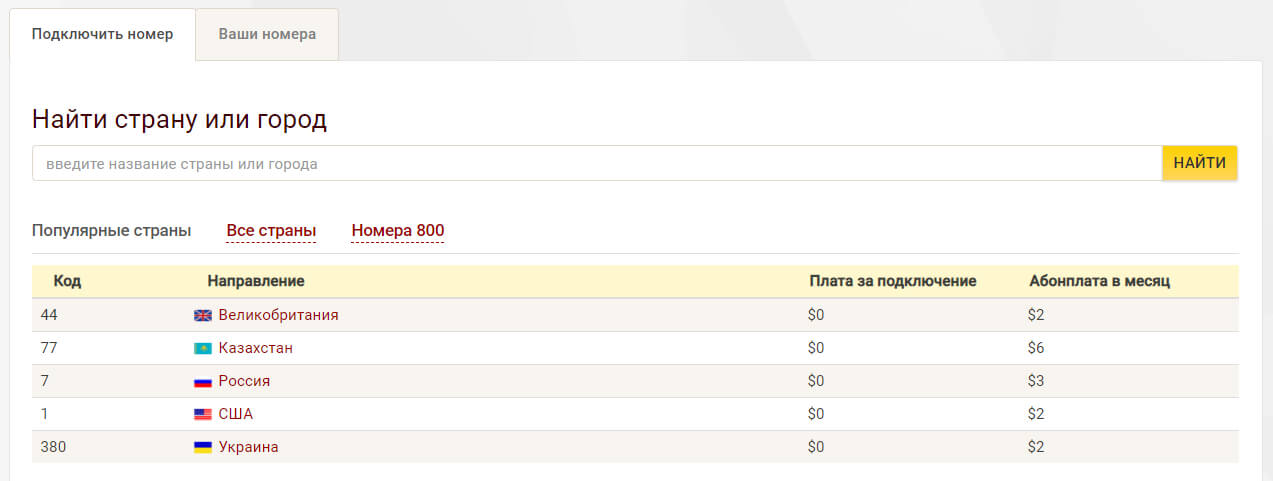 Сверху отображается список популярных стран (всего их доступно более 10). Для большинства стран подключение номера бесплатно — вы платите только ежемесячную абонентскую плату за использование номера.