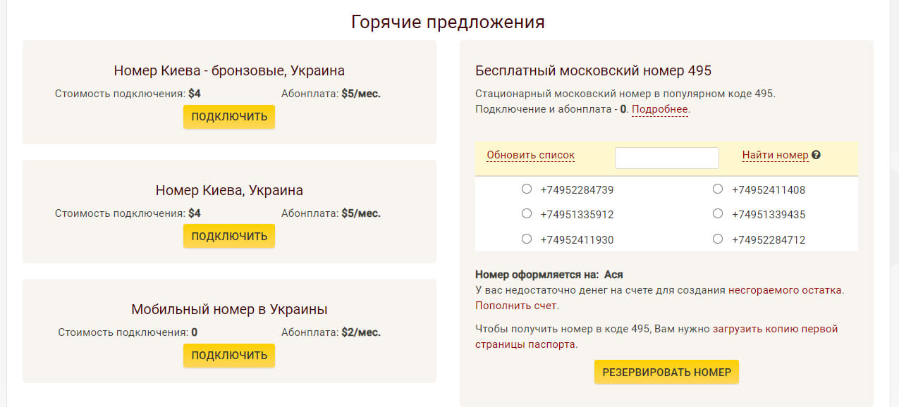 Если спуститься ниже, можно увидеть спецпредложения — например, красивые номера или бесплатное подключение стационарного московского номера с кодом 495*