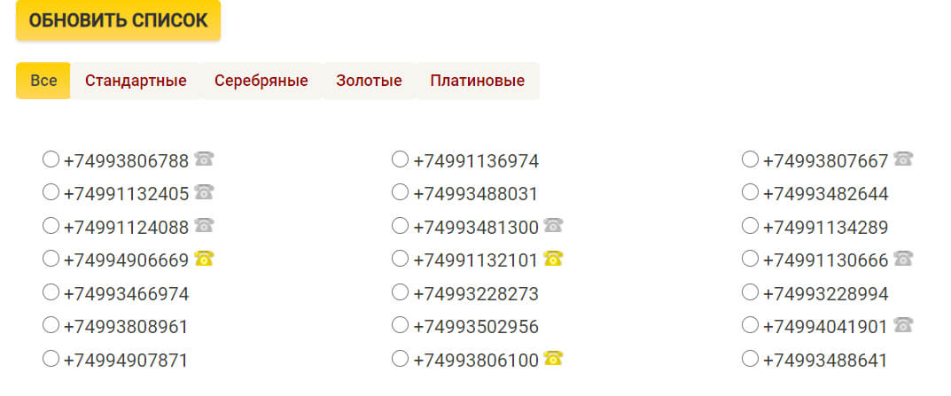 Выбираем доступные номера из списка. Напротив некоторых номеров вы можете заметить иконку в виде цветного телефона — это «красивые» номера (серебряные, золотые и платиновые). Они стоят чуть дороже обычных.