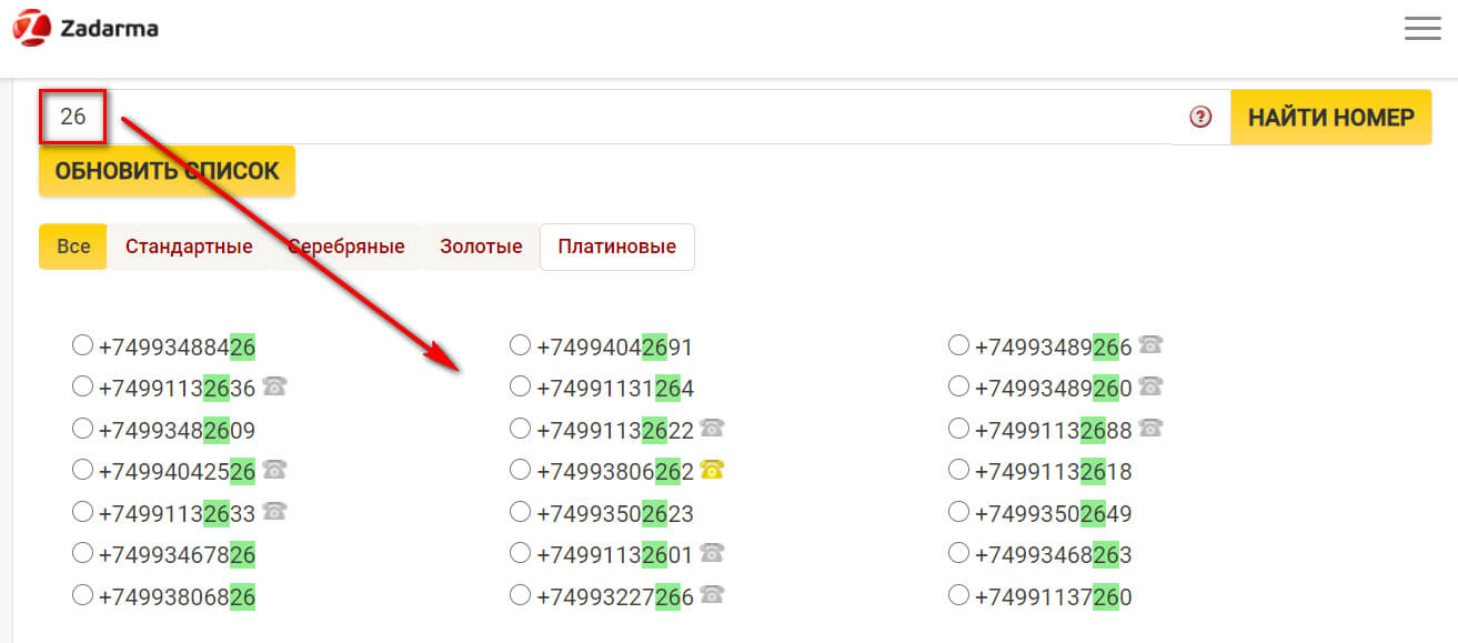 Можно выбирать не только из списка, но и ввести в строку поиска цифры, которые должны быть в номере, например, 26 — сервис покажет доступные номера с этими цифрами.