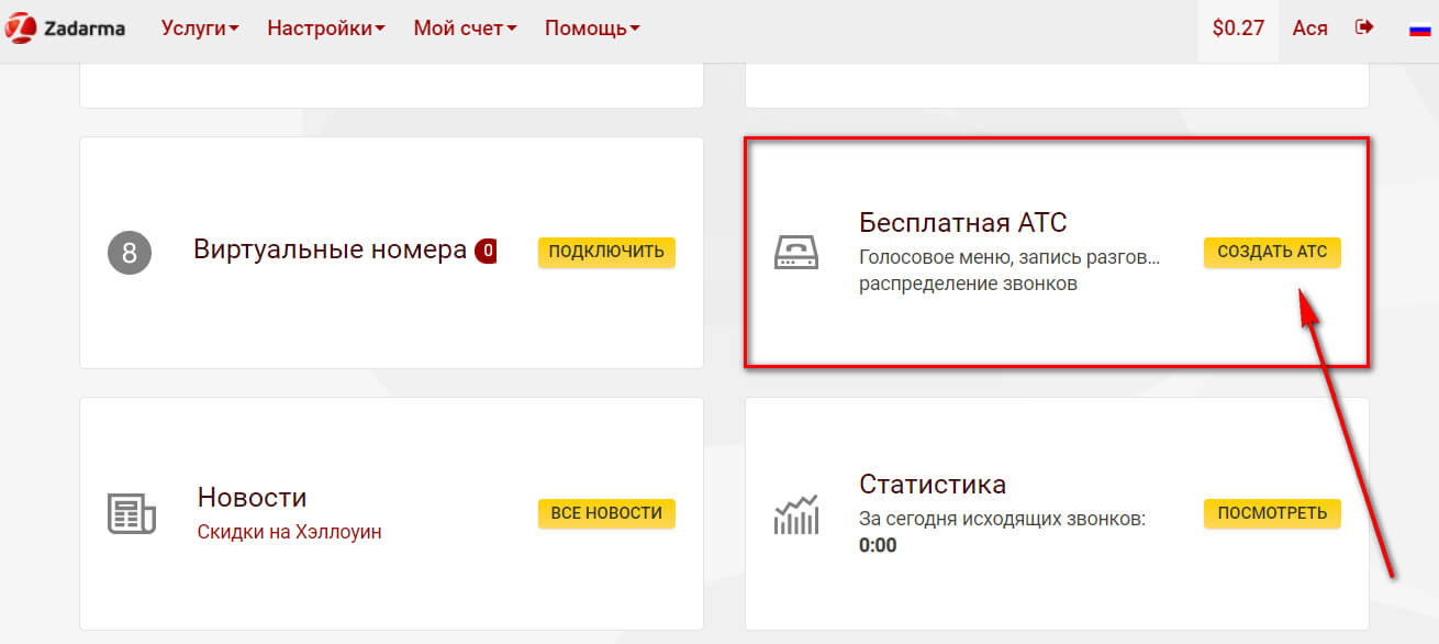 Чтобы подключить АТС заходим в личный кабинет — на главной находим раздел «Бесплатная АТС» и жмем «Создать АТС».