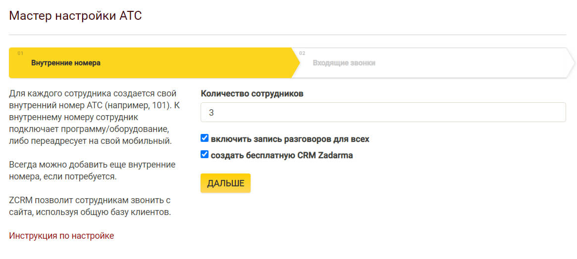 Указываем, сколько сотрудников будут пользоваться звонками. Для каждого создается свой внутренний номер в системе. Можно сразу включить функцию автоматической записи звонков и подключить бесплатную ZCRM (либо сделать это позже).