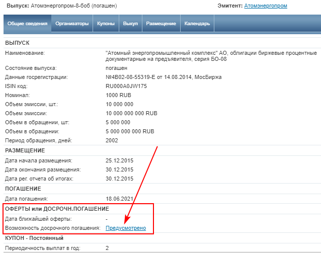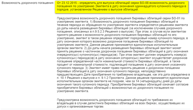 В карточке конкретной бумаги всегда есть информация о досрочном выкупе.