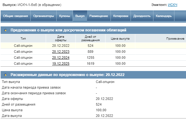 Выпусков с колл-опционом на Московской бирже тоже достаточно. Порядок действий такой же, как при анализе другого вида оферты: открываем карточку, переходим во вкладку “Выкуп”. Например, ИСКЧ-1-боб предусматривает 4 call-опциона ежегодно до декабря 2025 г. Инвестор может не посмотреть эту информацию, а соблазниться на высокие купонные выплаты в размере 10,75 % годовых до июля 2026 г. Но первая же оферта в декабре 2022 г. может лишить его такой доходности. Все будет зависеть от желания эмитента.
