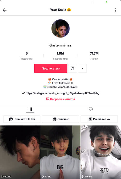 Это все можно указывать и до популярности. Еще многие пишут логин своего Инстаграм аккаунта. Призыв к действию и контакты помогут получить дополнительный трафик, а также заказы от рекламодателей. Мы уже писали, что за счет Тик-Тока можно набрать подписчиков для Инсты, Ютуба, Телеграм-канала.