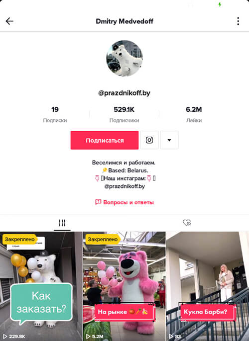 Девиз компании. Вот пример аккаунта с ростовыми куклами. Описание профиля лаконичное — «Веселимся и работаем». В принципе, в этом суть работы человека в костюме мишки и заключается.