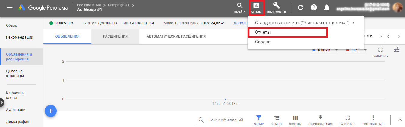 Чтобы ознакомиться с данными отчётов в Google Рекламе, кликните по соответствующей ссылке в верхней части дашборда и перейдите в раздел «Отчёты».