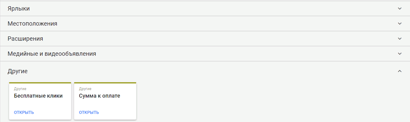 Отчёт «Бесплатные клики» покажет взаимодействия пользователей с рекламой, за которые рекламодатель ничего не платил. Это могут быть клики по встроенному видео, расширениям, раскрывающимся изображениям и другим элементам объявлений. Чтобы посмотреть данные по бесплатным кликам, кликните по соответствующему пункту во всплывающем меню отчётов «Другие».