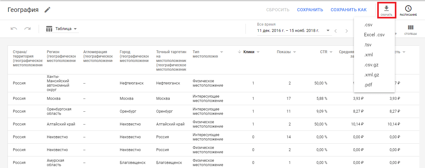 Любой отчёт, сформированный Гугл Рекламой, при необходимости можно экспортировать из интерфейса сервиса. Сделать это очень просто. Выберите нужный отчёт, найдите в верхней правой части интерфейса кнопку «Скачать» и кликните по ней.