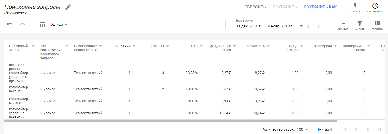 Отчёт «Поисковые запросы» покажет, по каким запросам ваша реклама демонстрируется пользователям. Для каждого запроса собирается отдельная статистика — по количеству показов, переходов, средним позициям, конверсии, CTR и т. д.