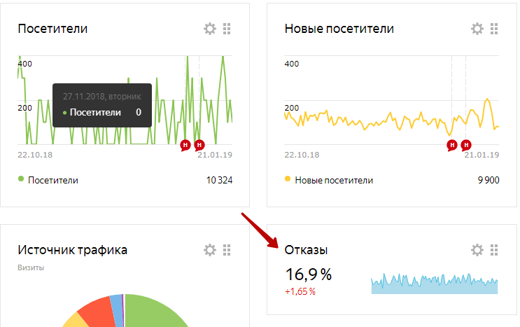 Узнать процент отказов можно в Яндекс.Метрике. Обратите внимание на то, что Метрика считает отказом визит, при котором посетитель просмотрел всего одну страницу и провел на ней меньше 15 секунд (по умолчанию).