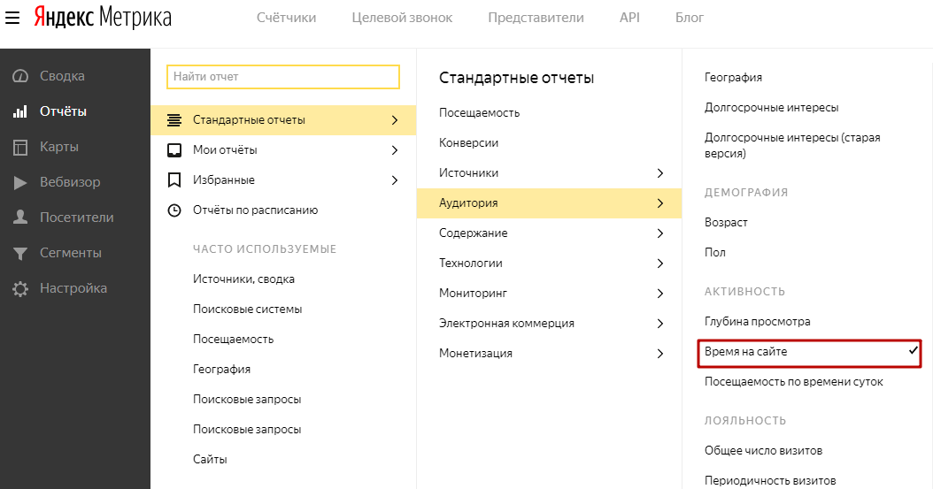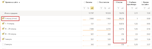 Также можно посмотреть процент отказов в отчете «Время на сайте»: