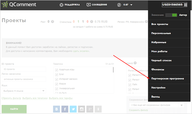 Ссылку вы найдете в разделе “Партнерская программа”, нажав на полоски рядом с ником.