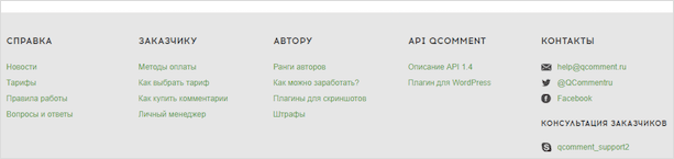 Внизу страницы расположены ссылки с полезной информацией для вебмастеров, заказчиков и авторов.