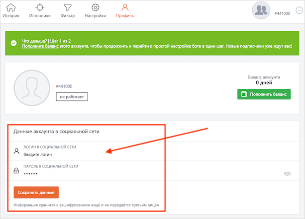 Чтобы сервис начал работать, пополняем баланс. Нажимаем на кнопку “Пополнить”.