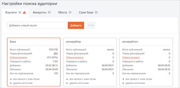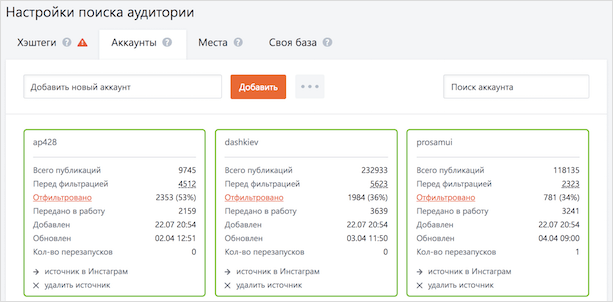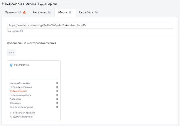 Рекомендуем для начала добавить пару хэштегов, аккаунтов или мест. Чтобы сервис быстрее их обработал и запустил в работу. Когда активность начнется, добавите остальные.