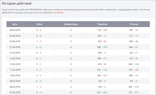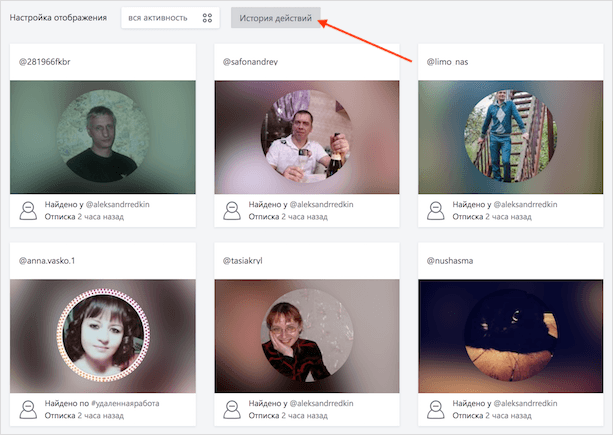 В истории вы найдете результаты работы Памаграм и увидите профили людей, по которым совершались действия.
