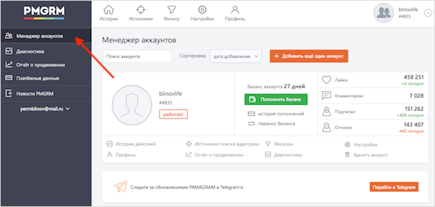 Теперь, когда вы вошли в личный кабинет на Памаграм, необходимо добавить Instagram-аккаунт, который собираетесь продвигать, и оплатить работу сервиса.