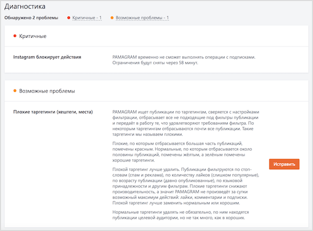 Также не рекомендуется использовать молодые аккаунты, которым меньше месяца, сработает алгоритм, защищающий от спама, и могут заблокировать совсем. Данные рекомендации касаются не только Памаграм, но и других сервисов массфолловинга.