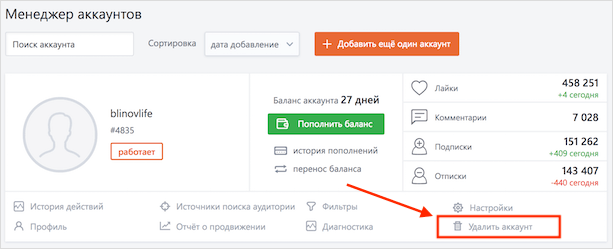 Список всех добавленных профилей находится во вкладке “Менеджер аккаунтов” в левом меню сайта.