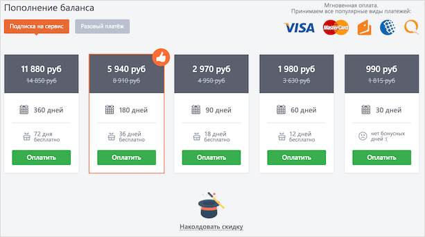 Открывается окно с тарифами и скидками. Цены средние. Если сравнивать с аналогами, то по качеству и удобству работы явное преимущество.