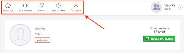 Вверху личного кабинета есть меню со всеми настройками. Начнем по порядку, порядок начинается справа налево.